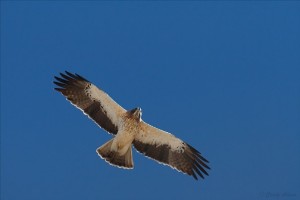 De dwergarend – grootte 45 – 50 cm, spanwijdte 110 – 132 cm, is ongeveer net zo groot als een buizerd en is daarmee de kleinste arend die in Europa voorkomt. Het bijzondere aan deze soort is dat die in twee kleurvormen voorkomt, een lichte en een donkere vorm. De lichte vorm is het meest talrijk en in deze kleur is de arend ook het best te herkennen. In deze vorm is het voorste gedeelte van de vleugels, en de romp kenmerkend wit gekleurd, met een brede donkere vleugelachterrand. De staart heeft een gruizige kleur en de kop is ook donkerder dan de romp, grijs/bruin gekleurd. In de donkere vorm is de roofvogel gemakkelijk te verwarren met bijvoorbeeld een zwarte wouw, buizerd of bruine kiekendief maar is door de rechthoekige staart te onderscheiden. Dwergarenden komen voor in het zuidelijke deel van Europa waarin Frankrijk de noordelijke grens van het gebruikelijke verspreidingsgebied aangeeft. Het aantal broedparen wordt in Europa geschat tussen de 4500 – 9000 waarvan minimaal ongeveer 3000 broedparen in Spanje voorkomen. Spanje is dus een belangrijk toevluchtsoord voor deze soort en de vogels komen zo goed als voor in alle regio’s, de canarische eilanden, Ceuta en Melilla zijn hierop een uitzondering. Hier kan de soort alleen tijdens de trek worden waargenomen.